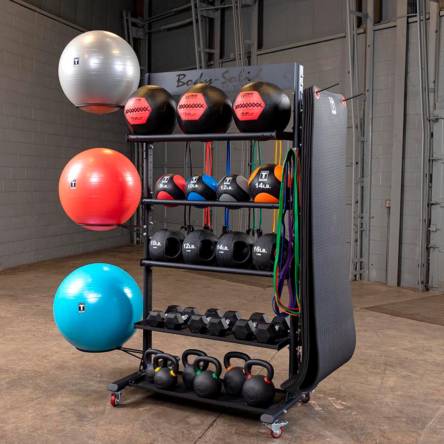 Pitää tavarat järjestyksessä, turvassa ja puhtaana. Body-Solidin säilytysteline on suunniteltu säilyttämään muun muassa painopalloja, kuntoilupalloja, jumppapalloja, kahvakuulia ja erilaisia käsipainoja sekä jumppamattoja. Kolme putkilla varustettua tasoa säilöö kätevästi erilaisia palloja ja kahdelle levytasolle sijoittaa näppärästi painavammat kahvakuulat ja käsipainot. Telineen reunoissa on jumppapalloille sekä matoille säilytyspaikkoja. Telineen pohjassa on siirtopyörät telineen helppoon liikuttamiseen ja pyörät voi halutessaan myös irrottaa.