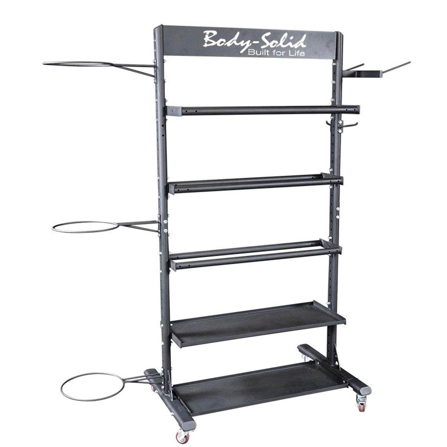 Body-Solid GAR250 on yksi monipuolisimmista kuntoiluvälineiden säilytystelineistä ja se soveltuu erinomaisesti yhteisö- ja kuntosalikäyttöön.