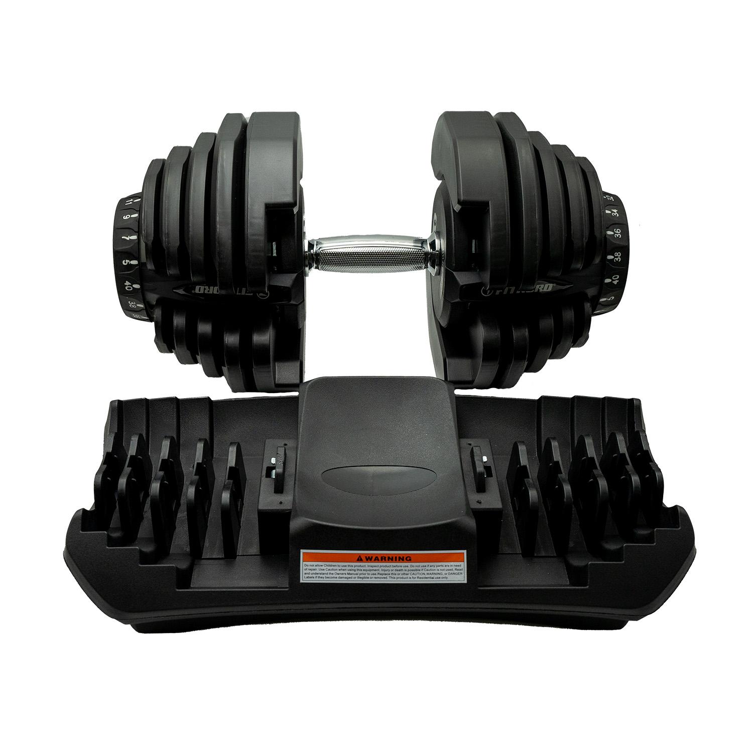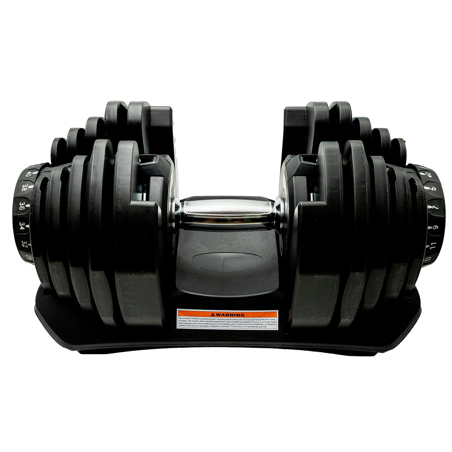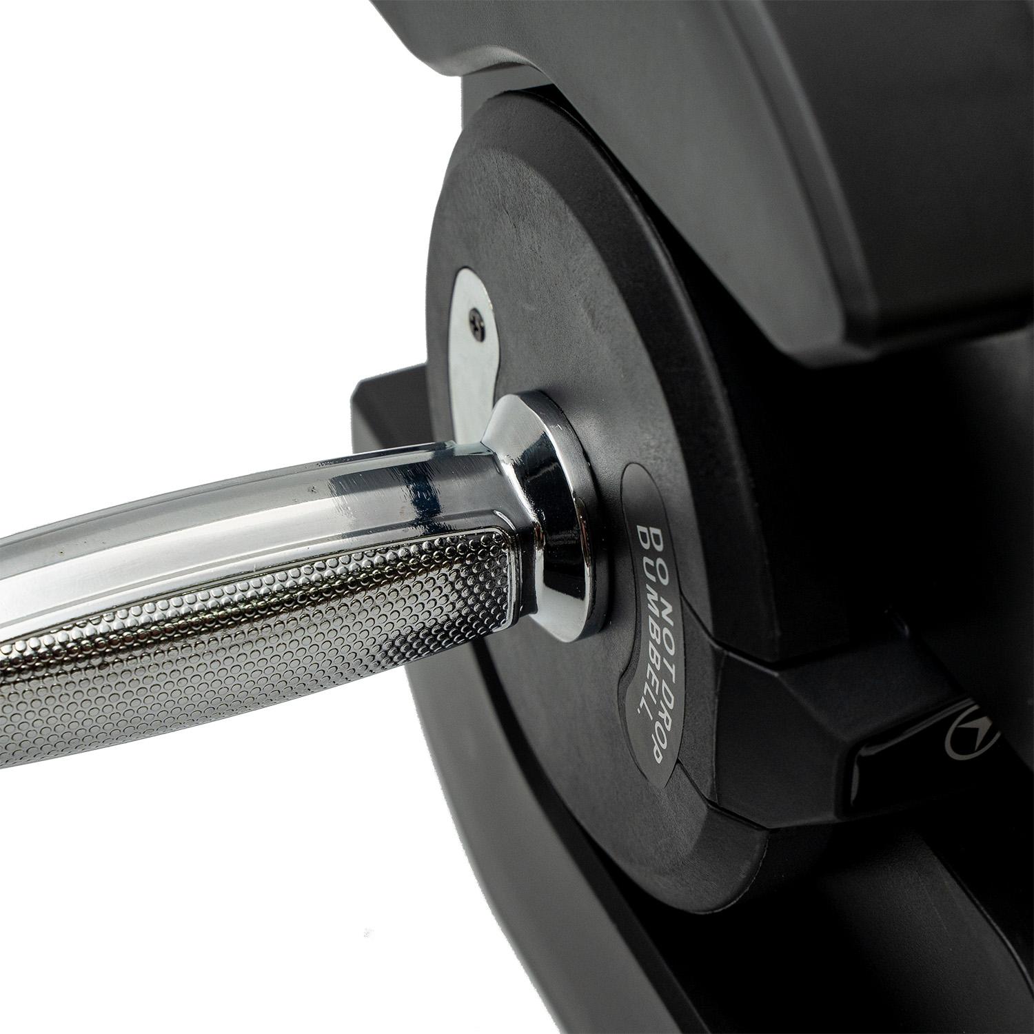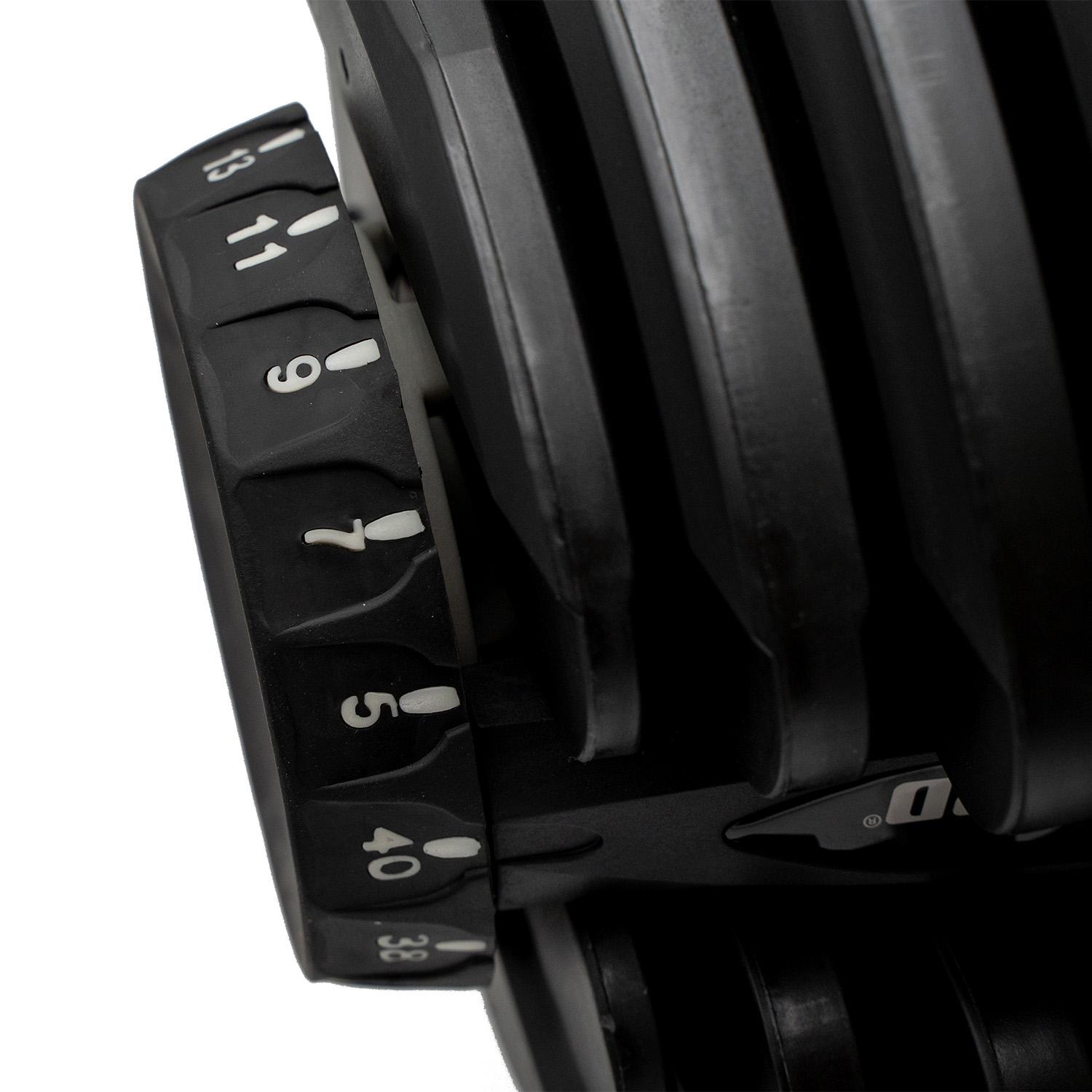 Käsipaino on säädettävissä 2–3 kg välein 5 kilosta aina 40 kiloon asti (5, 7, 9, 11, 13, 15, 18, 20, 22, 25, 27, 29, 32, 34, 36, 38 ja 40 kg). Painon muuttaminen tapahtuu kääntämällä päädyistä löytyviä säätörullia, jolloin käsipaino nostaa mukanaan oikean määrän levypainoja. Painon säätäminen onnistuu sujuvasti ja helposti.2. Kätevä säilytysalusta – käsipaino ja levypainot pysyvät paikoillaan näppärästi
