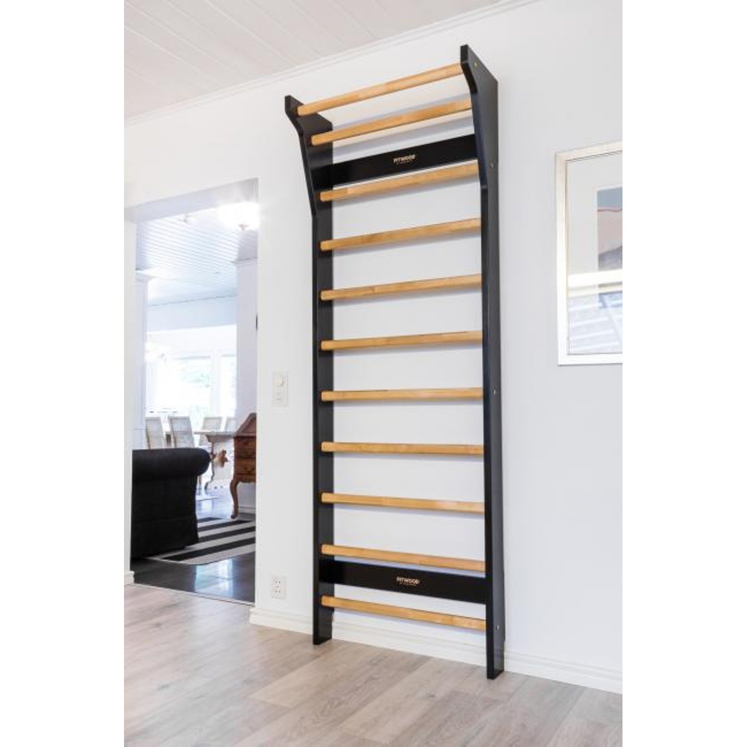 - Kiinnittämällä FitWoodin voimistelurenkaat puolapuihin: Kehonpainosoutu, dipit, tuetut askelkyykyt, rintalihasliikkeet ja paljon muuta.