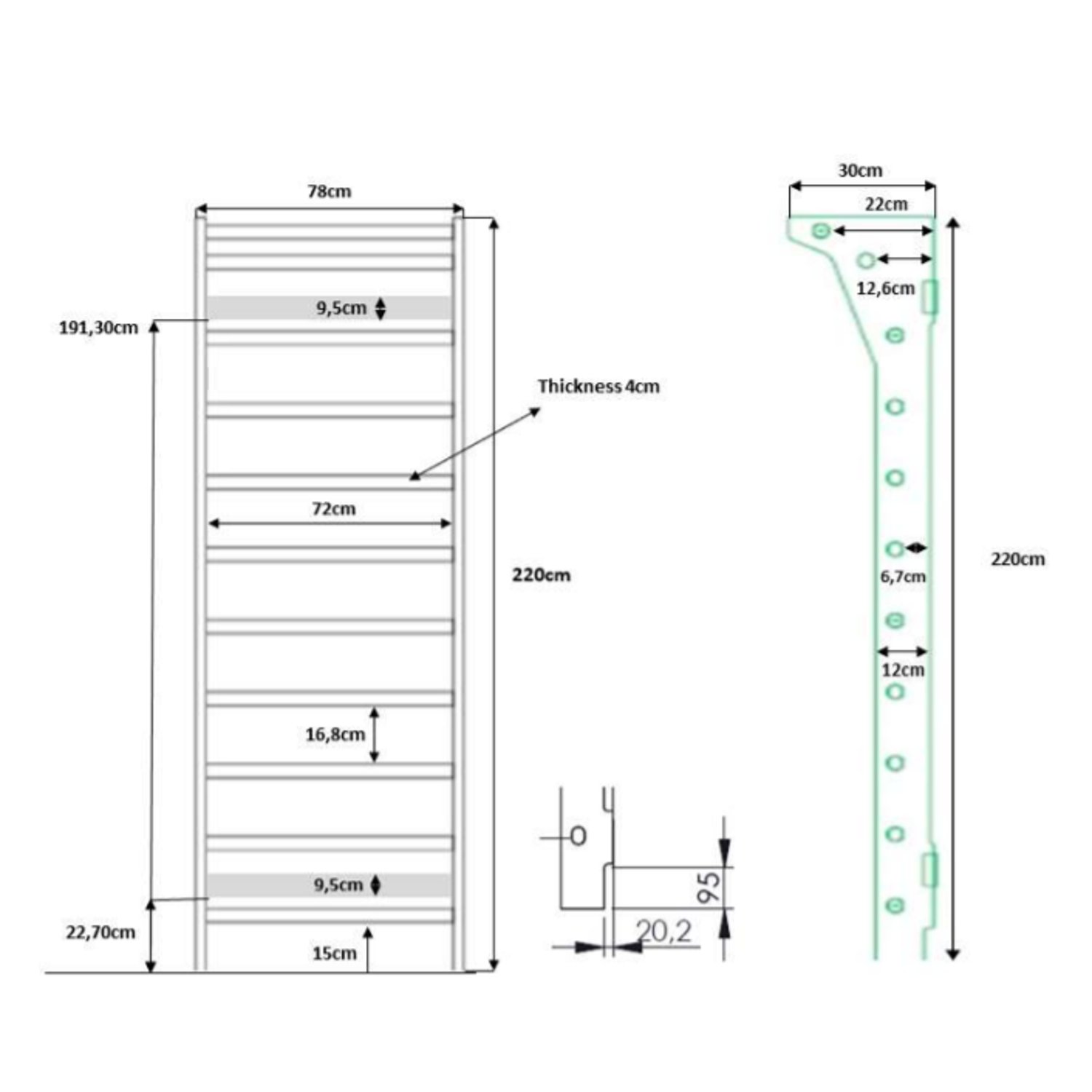 - Mitat: Korkeus 220 cm, Leveys 78 cm, Syvyys yläosassa 30 cm ja rungon kohdalla 12 cm