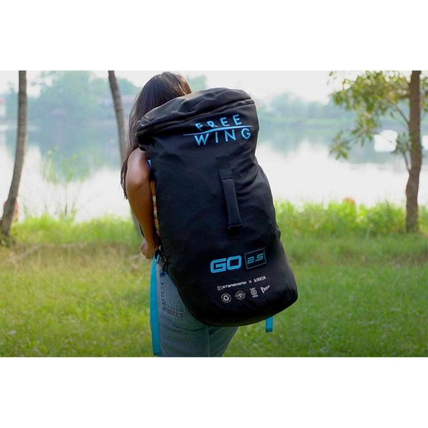 Freewingin käyttöönotto on nopeaa. Se pakkautuu pieneen reppuun ja on nopea täyttää - maksimipaine on 7 PSI. Huom! Pumppu ei kuulu pakkaukseen mukaan.