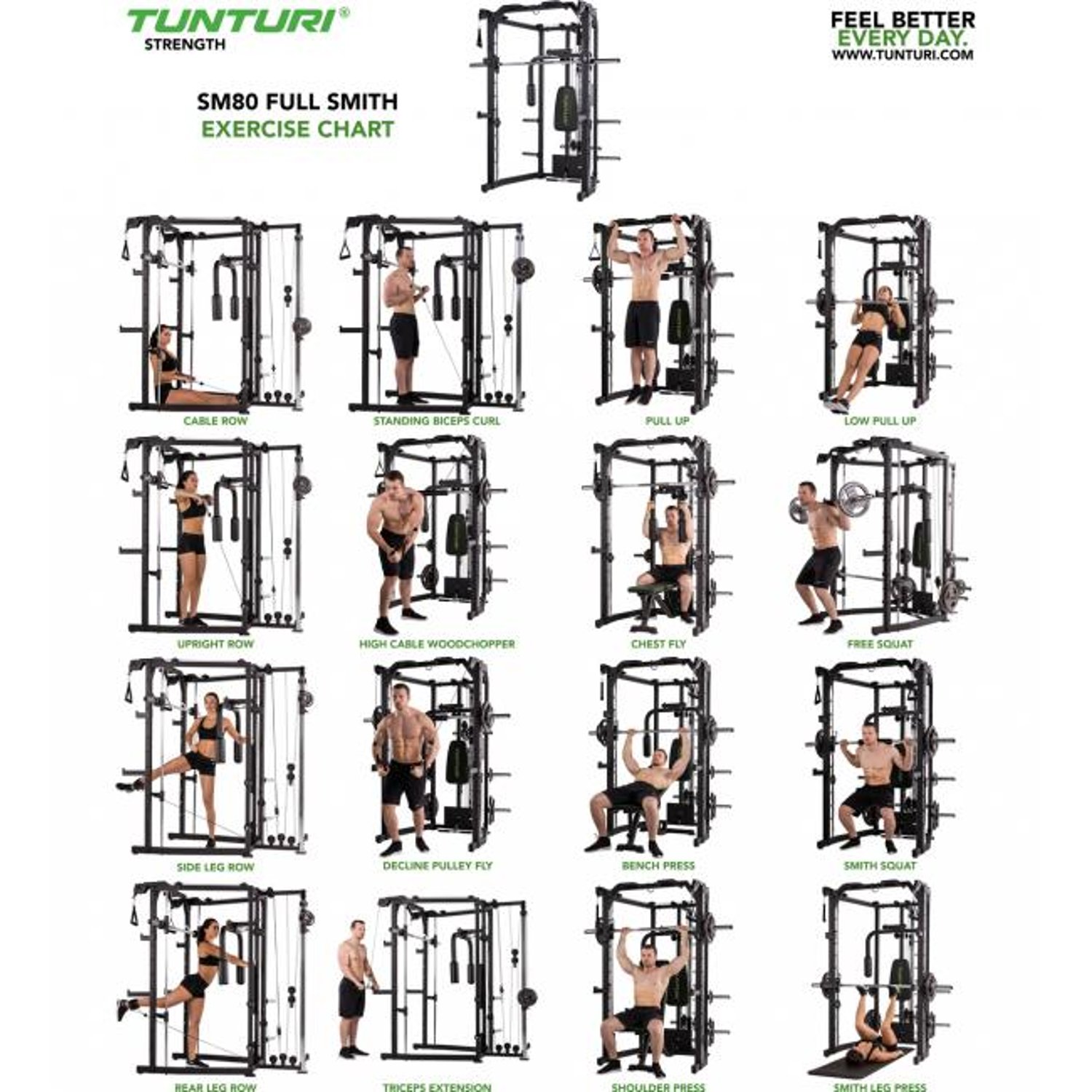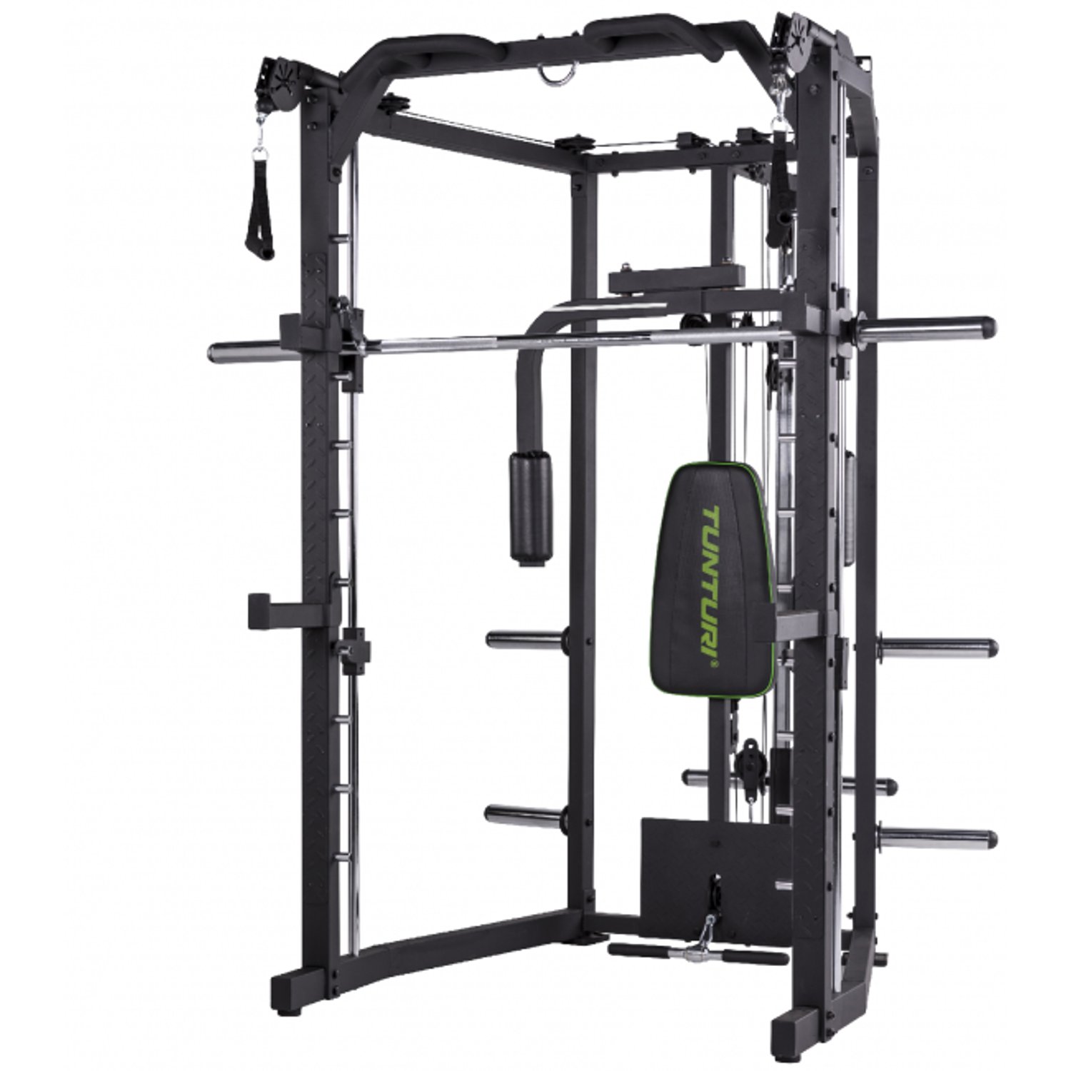 Tunturi SM80 Smith Machine -kuntokeskus sisältää kyykkyhäkin smith-laitteella, monipuolisen taljalaitteen, leuanvetopaikan, koukun nyrkkeilysäkille tai Functional Trainer hihnoille sekä rintalaitteen. Yhdistämällä tähän kokonaisuuteen säädettävän vinopenkin, on käytössäsi mitä monipuolisin harjoitusasema. Tunturi SM80 Smith Machine -laitteella on sujuva taljajärjestelmä ja vankka runko. Harjoittelun turvallisuuteen ollaan myös kiinnitetty erityistä huomiota. Laitteella on mahdollista käyttää ja säilyttää 50 mm levypainoja. Oman tangon tuomalla häkille pystyt myös tekemään vapaa harjoittelua.