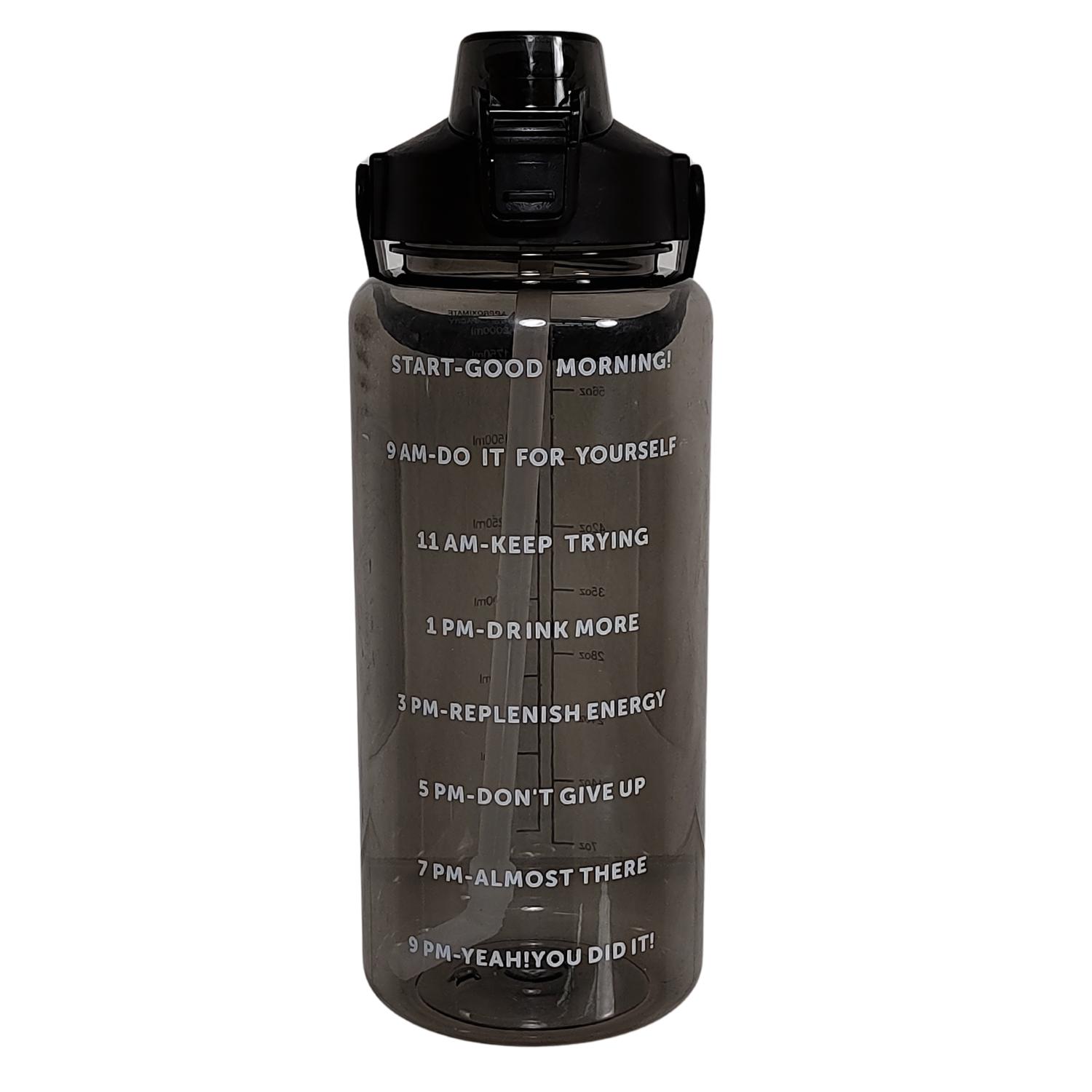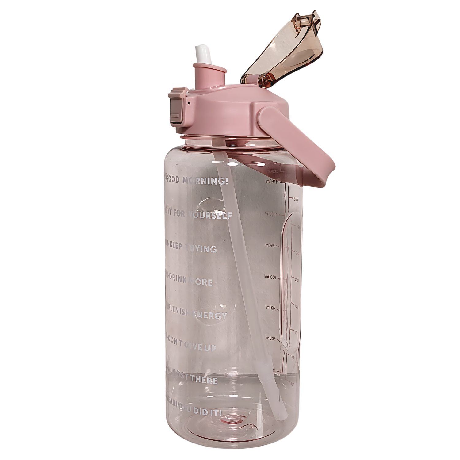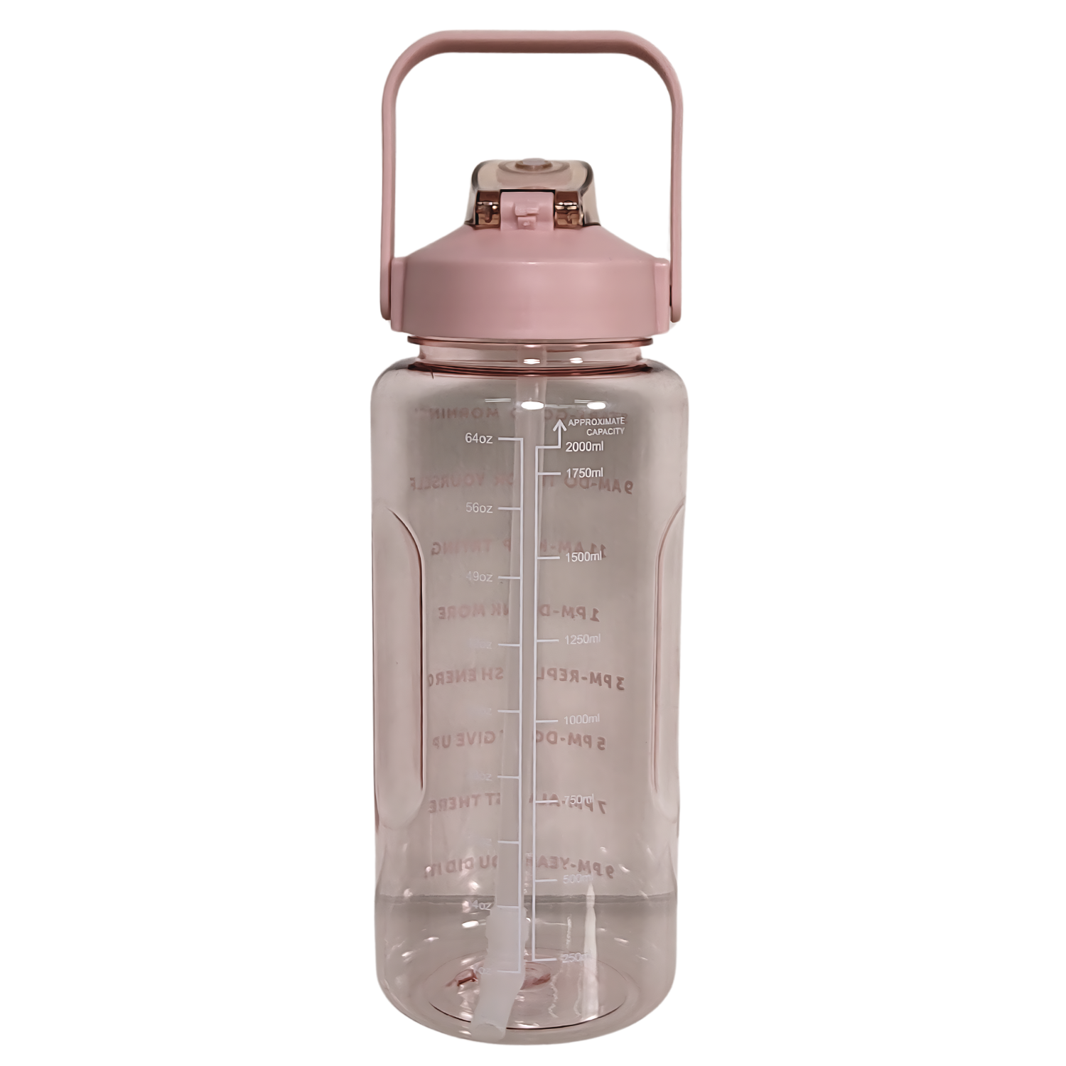 Pillillä varustettu 2 litran juomapullo, joka kannustaa juomaan vettä päivän mittaan kätevän aikamerkinnän avulla.