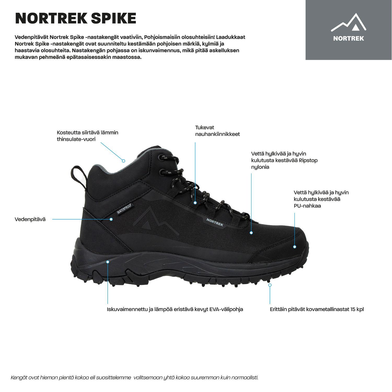Nortrek Spike -nastakengät on suunniteltu Suomessa kestämään vaativimmatkin pohjoiset sääolosuhteet. Nastakenkien pohja tarjoaa paitsi vankan pidon myös huippuluokan iskunvaimennuksen, tehden liikkumisesta miellyttävän kokemuksen talvisissa olosuhteissa. Pohjassa on 15 kovametalli Tungstenista valmistettua nastaa, jotka takaavat pitävyyden liukkailla alustoilla, eikä niiden irtoamista tarvitse pelätä.