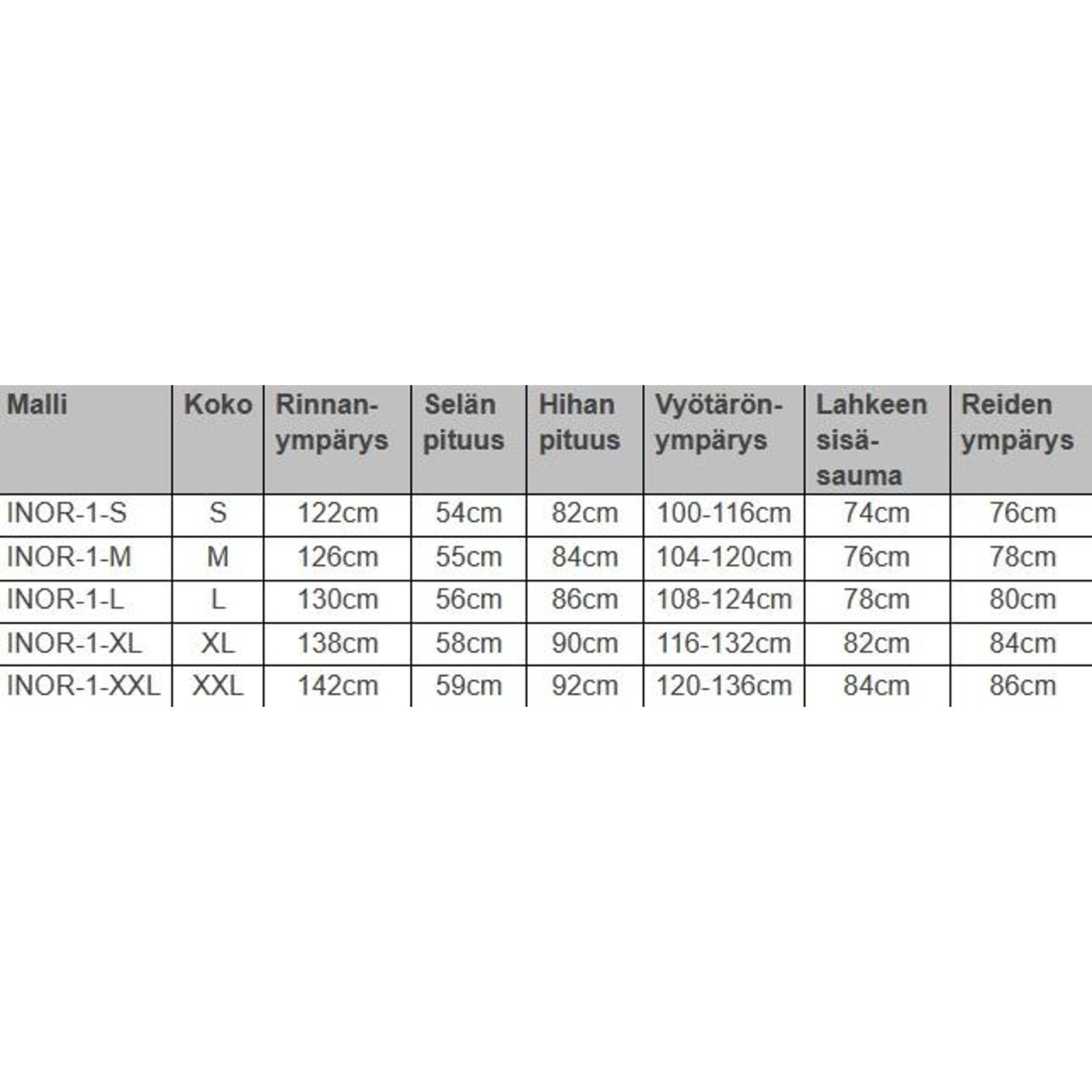 Kevyt ja lämmin Inuit Nordic lämpöhaalari on valmistettu täysin tuulen- ja vedenpitävästä (10.000mm) X-4 Flex kankaasta. Joustavasta X-4 Flex kankaasta valmistetut lämpöpuvut säilyttävät notkeuden ja ovat miellyttäviä käyttää kovemmassakin pakkasessa. Kankaan pintamateriaali on käsitelty vettä ja likaa hylkivällä DWR pinnoitteella. Lämmin ja pehmeä 200g/m polyesterivuori, hyvin suojaava huppu ja korkea fleecekaulus pitävät kylmyyden erinomaisesti loitolla. Haalarin lahkeissa on vetoketjuilla avautuvat lahkeensuut, jotka helpottavat pukemista ja etenkin pitkävartisten jalkineiden käyttöä. Haalarissa on runsaasti käytännöllisesti sijoiteltuja taskuja ja myös fleecevuorelliset käsien lämmittely taskut.