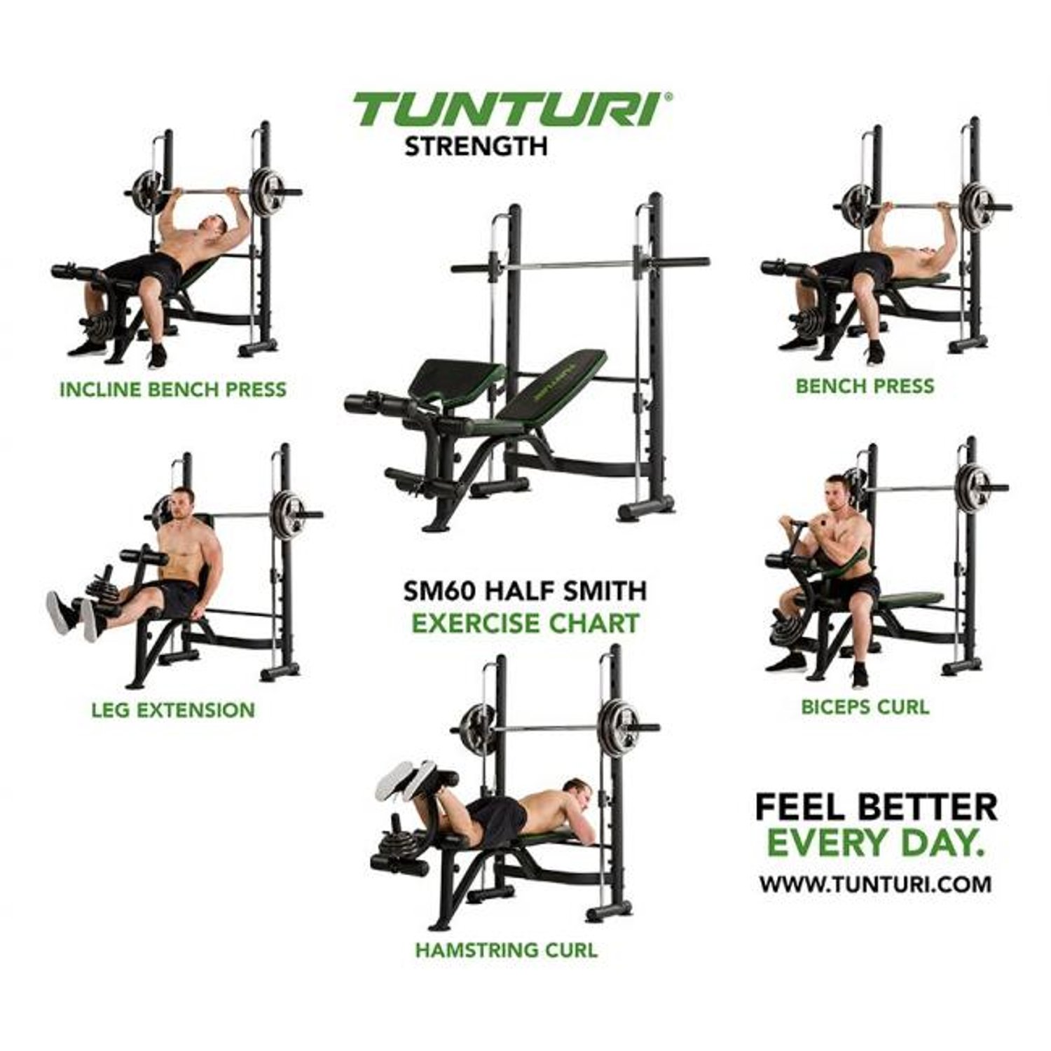 Tunturi SM60 Half Smith -kuntokeskus on pienempäänkin tilaan mahtuva monipuolinen voimailuasema kotikäyttöön. SM60 on kevyempi versio järeästä SM80 Smith -kuntokeskuksesta, josta löytyy lisäksi myös taljajärjestelmä.